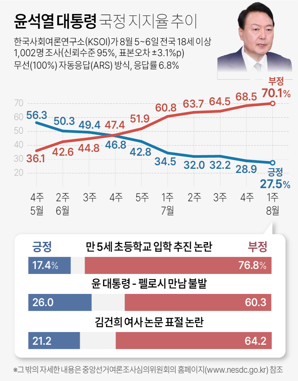 이 같은 정책 혼선이 드러나자 8월 1주 조사에서 윤 대통령 지지율은 정부 출범 후 최저치인 24%를 기록하게 되었습니다.
