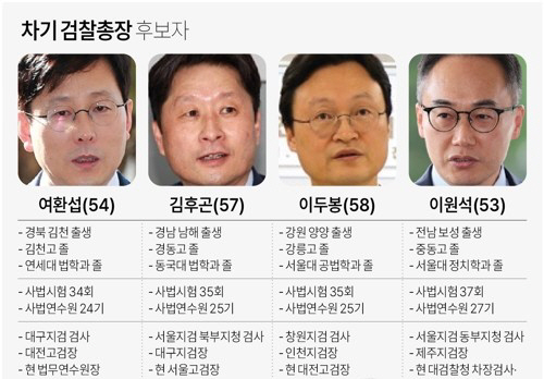 법조계에 따르면 검찰총장후보추천위원회(추천위) 차기 총장 후보군으로 추려진 인물 4명 모두 검찰 내 '특수통'으로 분류되는 인물들이지만 이두봉 고검장과 이원석 검사가 '친(親)윤'으로, 여 원장과 김 고검장은 '비(非)윤'으로 나뉘는 차이점이 있습니다.