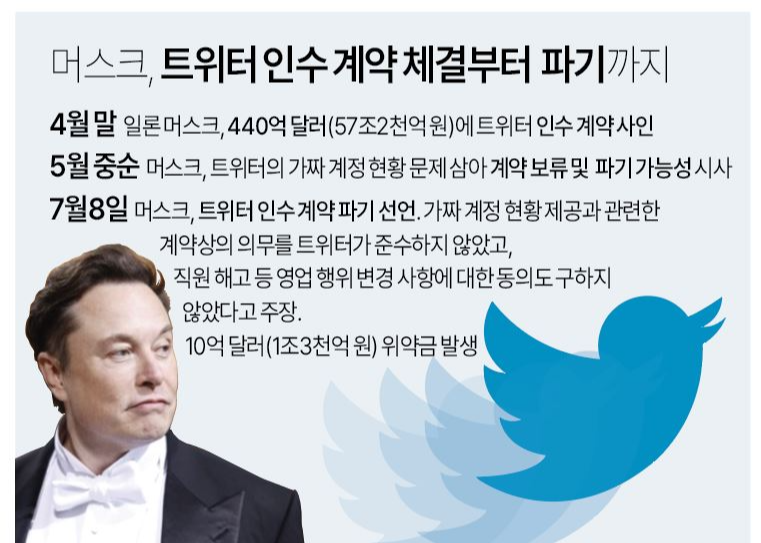 머스크가 트위터 인수 거부 의사를 번복한 것은 계약 이행을 강제하기 위해 트위터가 제기한 소송을 2주 정도 앞두고였는데요, 일각에서는 승소하기 어렵다는 판단에 따른 것이라는 예상입니다. 이후 기업 간 분쟁 사건을 다루는 델라웨어주 형평법 법원이 머스크와 트위터 간 소송전을 일시 중단시켰구요, 28일까지 인수를 완료하라고 명령한 것입니다.