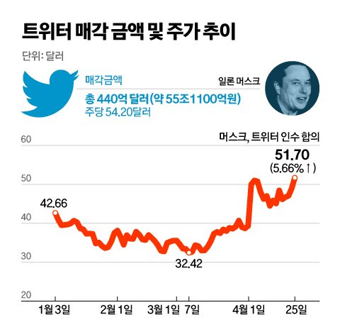 머스크가 지난 5일 이를 철회하고 원래 계약대로 인수하겠다고 밝히면서 상황이 오늘에 이르게 된 것입니다. 트위터가 미국 증권거래위원회(SEC)에 보고한 바에 따르면 머스크는 트위터쪽에 편지를 보내 지난 4월 약속한 대로 주당 54.2달러에 인수하겠다고 의사를 전달한 것으로 알려졌습니다. 따라서 머스크의 트위터 인수 비용은 440억달러(약 63조원)에 이르게 되는 것이며 이 소식이 전해진 후 트위터 주가는 전날보다 22%나 폭등하기도 했어요.