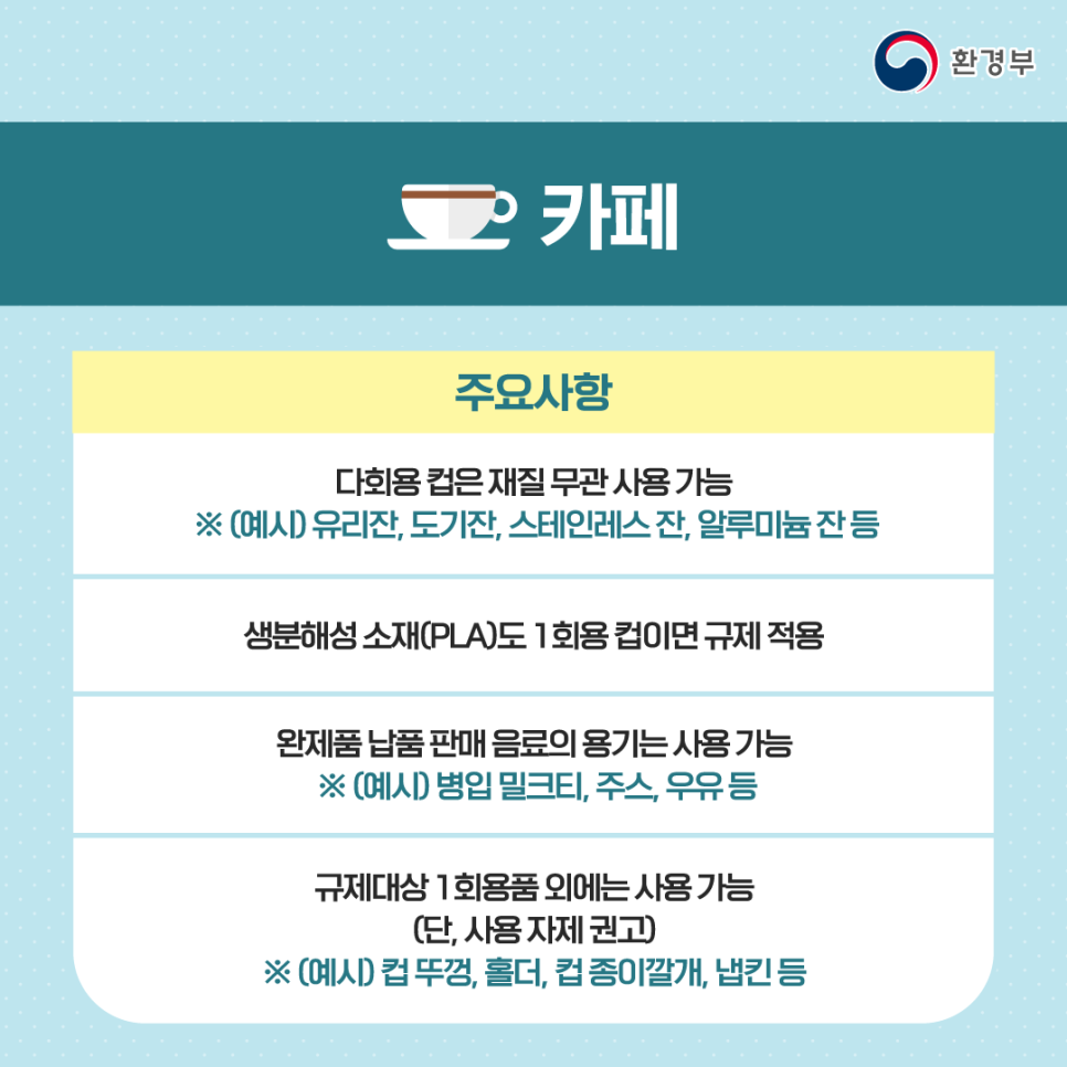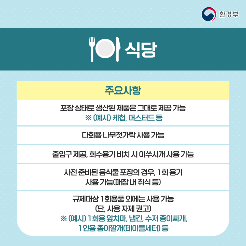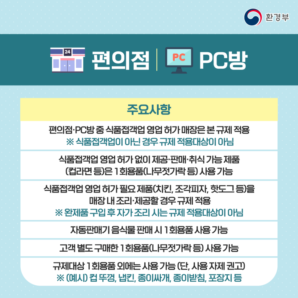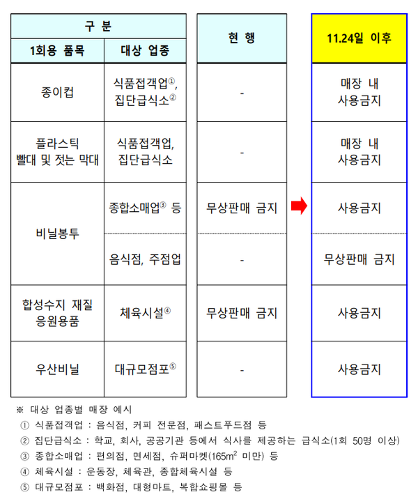 1. ‘식품접객업’으로 분류된 식당·카페나 ‘집단급식소’ 내 종이컵, 플라스틱 빨대, 젓는 막대 등의 사용이 금지됩니다. ‘종합소매업’ 매장(마트·편의점이나 일반 소매점 등)에서 기존에 유상판매 되던 비닐봉투는 아예 비치되지 않으며 비가 올 때 우산에 있는 빗물이 바닥에 떨어지지 말라고 비치해놓는 ‘우산비닐’도 대규모 점포에선 사용이 금지된다고 합니다.