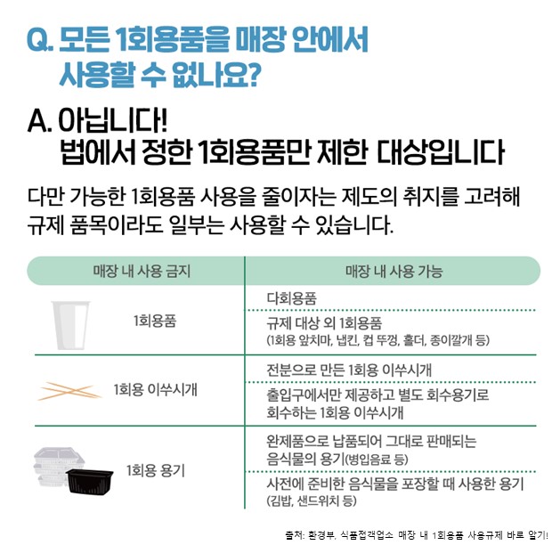 작년 12월 말 개정된 ‘자원의 절약과 재활용 촉진에 관한 법률 시행규칙’에 따라 일회용품 사용규제 조치를 어기고 일회용품을 사용하거나 무상으로 제공한 사람은 300만원 이하의 과태료를 부과할 수 있습니다.