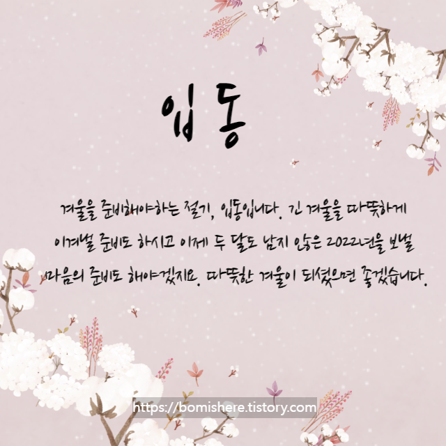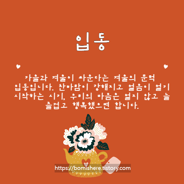 입동 인사말 이미지 (입동 뜻 속담 음식)을 소개합니다. 오는 11월 7일(월)이 벌써 입동입니다. 입동은 상강과 소설 사이에 드는 절기로 24절기 중에서는 열아홉 번째 절기에 해당해요.