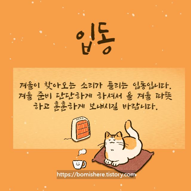 ♡ 겨울의 시작을 알리는 입동입니다. 이 시기가 되면 미세먼지가 심해지고 감기도 걸리기 쉽답니다. 건강관리 잘 하셔서 무탈한 겨울 맞이하시고 오늘도 좋은 하루 되시길 바랍니다.
