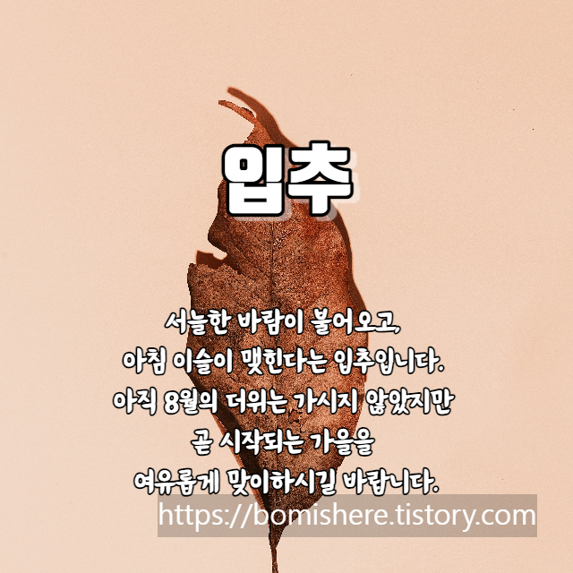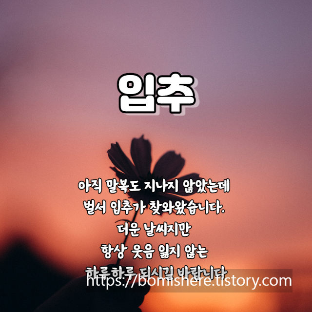 입추 인사말 이미지 매직 속담 음식 관련 시 모음을 정리했습니다. 2023년 8월 8일은 24절기 중 열세 번째 절기인 입추입니다. 과거 농경사회에서는 입추를 가을의 시작으로 여겼다고 하는데요,