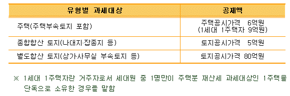• 토지를 보유한 경우 : 인별 소유한 전국 종합합산토지의 공시가격 합계약애 5억원을 초과하는 자