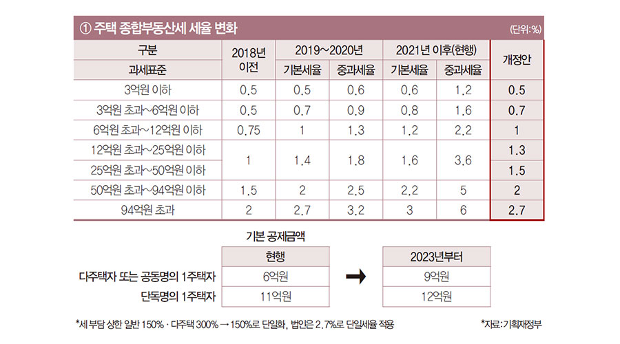 앞으로 종부세 과세대상 개편안은 과세 기준을 가액으로 전환하면서 종부세율을 2019년 수준인 구간별 0.5~2.7%로 하향 조정한다고 하는데요, 기존 12~50억원의 과표 구간 사이에 12~25억원 구간을 신설하고 종부세 세부담 상한은 현행 150%~300%에서 주택수에 관계없이 150%로 고정시킬 예정이라고 합니다.