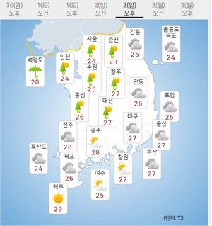 일요일에는 인천과 경기 서해안을 중심으로 20~60, 수도권 내륙을 중심으로는 최고 40mm의 비가 내릴 예정이며 화요일에는 전국에 비가 내리는 것입니다. 이 비가 그친 뒤, 기온이 큰 폭으로 떨어진다고 하니 추위에도 대비하셔야겠습니다. 3일 아침 최저기온은 15 ~ 22도, 낮 최고기온은 23~29도로 평년기온보다 조금 높겠습니다.