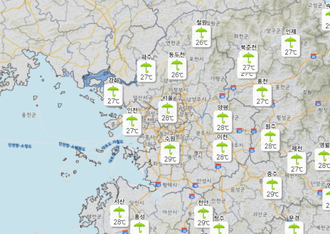 주말 날씨를 정리하면 제주를 제외한 전국에 비 예보가 포함되어 있는데요. 특히나 경기동부와 강원 영서 지역은 시간당 30mm 안팎의 세찬 비가 쏟아질 수도 있다는 것입니다.