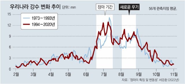 본래 장마 예상기간이 지나면 북태평양고기압이 한반도를 완전히 덮으면서 한여름 무더위가 시작되는 것이고 북쪽 찬 공기가 다시 남하하는 8월 말, 9월 초까지 큰비가 내리지 않는 게 일반적이었는데요, 이제 기후변화로 인해 장마 직후인 8월 초중순 또다시 큰비가 내리는 강수 경향이 자리를 잡고 있다는 것이 전문가들의 설명입니다.