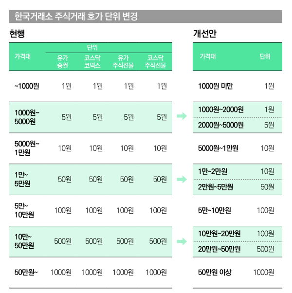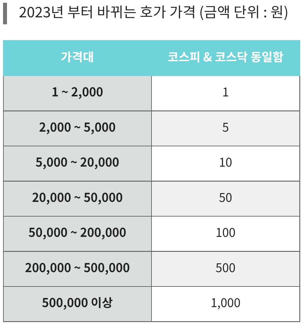 이 외 구간은 현행 호가단위를 유지합니다. (2000~5000원 미만 종목은 5원, 2만~5만원 미만 종목은 50원, 20~50만원 미만 종목은 500원, 50만원 이상 종목은 1000원)