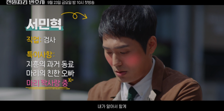 일명 강남 키드 검사로 철부지 매력을 품은 금수저. 2년간의 미국 연수를 마치고 일편단심 짝사랑해온 마리와의 결혼을 꿈꾸지만 검사 동기였던 천지훈을 만나기만 하면 유리멘탈이 되어버리고 맙니다. 한편으로는 프로페셔널한 검사지만 뒤로는 마리 앞에서 한없이 약해지는 반전 매력을 가진 순정남.