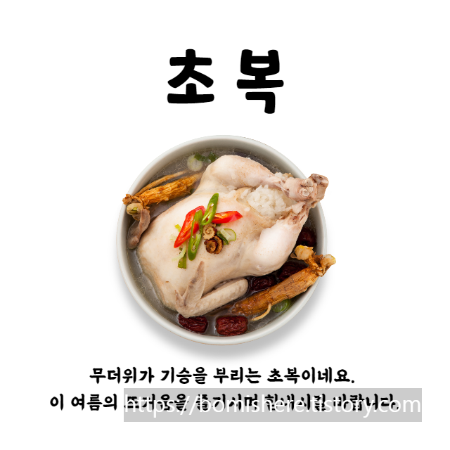 초복 인사말 문구 복날 이미지를 소개합니다. 초복은 한국의 전통적인 24절기 중 하나로, 음력 6월의 첫째 날부터 10번째 날까지를 가리킵니다. 초복은 한자로 '初伏’로 표기되며, '처음에 성토함’이라는 뜻을 가지고 있다고 하는데요,