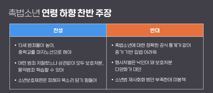 이처럼 촉법소년 범죄가 계속되자 촉법소년 연령하향을 주장하는 여론이 수년간 꾸준히 늘고 있습니다. 이에 따라 정부도 촉법소년 대상자를 만 14세 미만에서 12세 미만으로 개정하는 방안을 추진 중입니다.