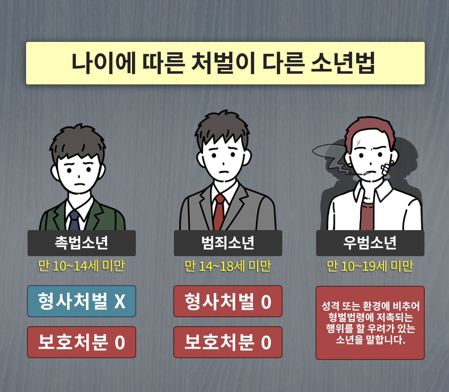 우리나라 형법에서 규정한 형사책임을 져야 하는 법 위반자가 미성년자일 때, 그들을 어떻게 처벌(처우)해야 하는지를 규정하는 특별법을 소년법이라고 합니다. 우리나라 소년법은 10살 이상 ~ 19살 미만을 “소년”으로 정의하고 있으며 이 중 10~13살은 촉법소년, 14~18살은 범죄소년으로 규정되어 있습니다.