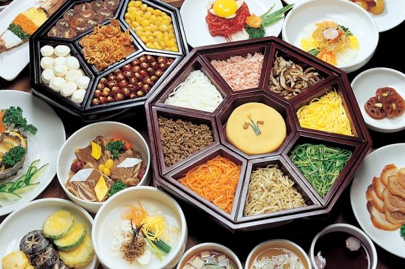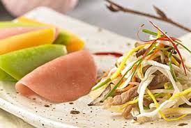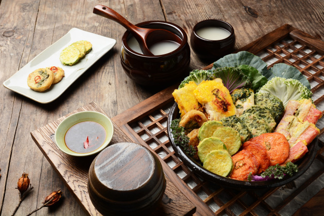 2. 밀전병: 얇게 부친 밀전병에 곱게 채 썬 호박, 소고기, 표고버섯, 당근, 계란 등을 넣어 먹는 것으로, 겨자 소스나 초간장 소스 등 입맛에 맞는 양념장을 찍어 먹습니다.