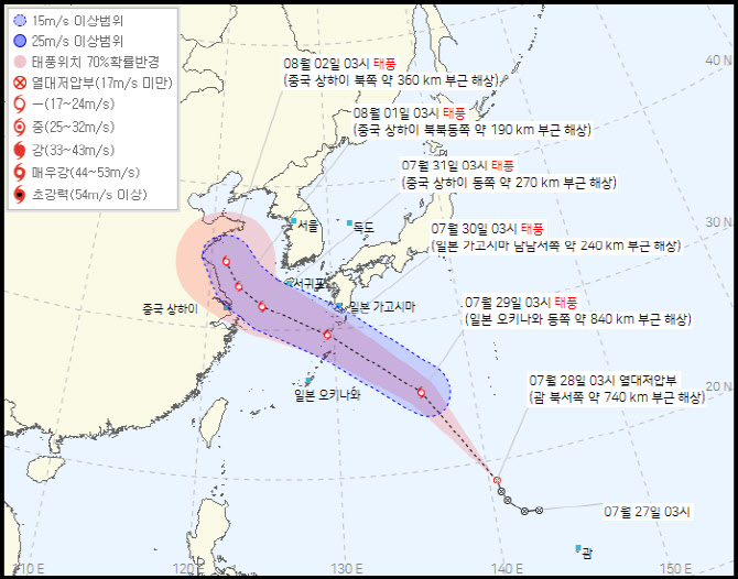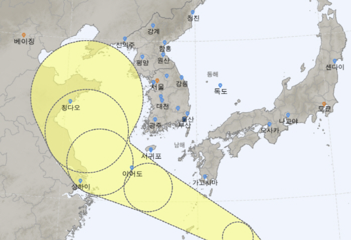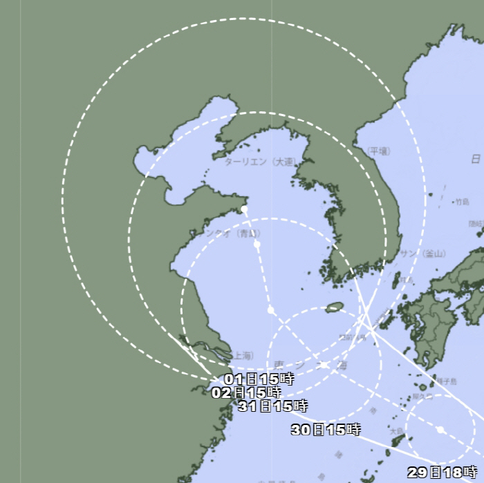 기상청에 따르면 이 태풍은 29일 오후 3시 일본 가고시마 남남동쪽 약 480km 해상 - 30일 오후 3시에는 중국 상하이 동쪽 약 480km 해상 - 31일 오후 3시 상하이 북동쪽 약 170km 해상 - 중국 칭다오로 향할 것 이라고 예상하고 있습니다.