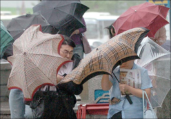 반면 태풍이 남쪽에서 고온 다습한 공기를 끌고 오기 때문에 비바람이 부는 제주도와 남해안과는 달리 내륙에는 뜨거운 공기를 불어넣게 됩니다.