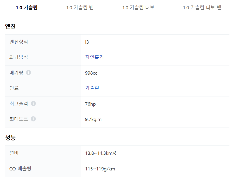 스마트스트림 가솔린 1.0엔진과 카파 1.0 터보 엔진 2가지가 탑재되어 경차임에도 불구하고 부족하지 않은 출력이라고 볼 수 있으나 넉넉하고 여유로운 사양을 원한다면 당연히 1.0 터보 엔진이 낫습니다.