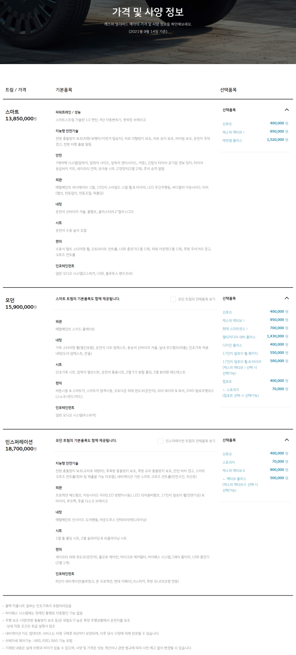 현대 캐스퍼 가격은 스탠다드 모델의 경우스마트 1385만원, 모던 1590만원, 인스퍼레이션 1870만원,터보의 경우 스마트 1480만원, 모던 1685만원, 인스퍼레이션 1960만원에 형성되어 있습니다. 사실 현대 캐스퍼 가격만 보면 경차 중에서 가장 비싸게 판매가 되고 있는 셈인데요, 아이러니하게도 가장 비싼 캐스퍼 인스퍼레이션 트림을 선택하는 비율이 제일 높다고 해요. 이는 아마 크기는 작지만 옵션이 좋기 때문이 아닐까 하는 추측입니다.