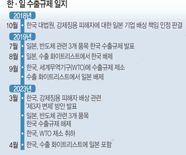 한·일 양국은 대법원의 강제징용 판결 직후부터 수출 규제로 분쟁을 이어왔다고 볼 수 있습니다. 일본은 2019년 7월 반도체 핵심 소재 3개 품목 수출 규제를 단행했고, 같은 해 8월에는 한국을 자국의 수출 화이트 리스트에서 배제했습니다.