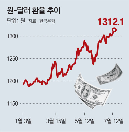지난 7월 29일 기준 원‧달러 환율은 전일 대비 3원 오른 1299.10원으로 2거래일 연속 1300원을 밑돌았습니다. 원‧달러 환율은 지난 6월 23일 1301.80원으로 종가 기준 1300원을 넘었는데요, 이후 7월 8일 이후 상승세를 이어가면서 한때 1326.70원까지 치솟기도 했습니다.