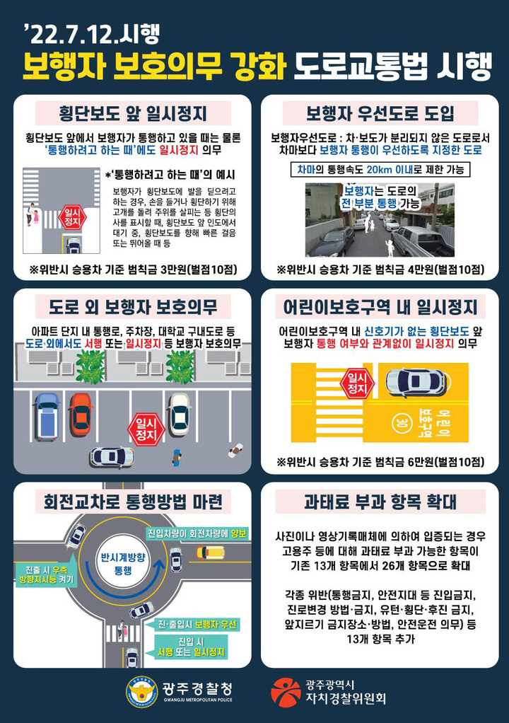 올해 도로교통법은 4월에 한 번 개정되고 7월에 개정이 된 건데요, 7월 개정 내용의 핵심이 횡단보도 우회전 시 보행자 보호 의무 위반 단속이 강화된 점이라고 볼 수 있습니다. 구체적인 내용을 좀 더 살펴보도록 하겠습니다.