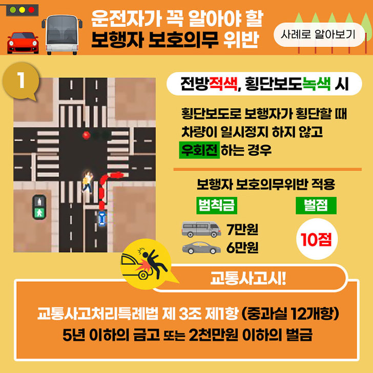 또한 횡단보도 우회전 시 보행자 보호 의무 위반 단속으로 교통사고가 난다면 교통사고처리특례법(12대 중과실)이 적용돼 5년 이하 금고 또는 2000만원 이하 벌금에 처해진다고 합니다.