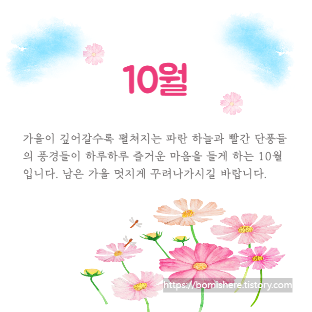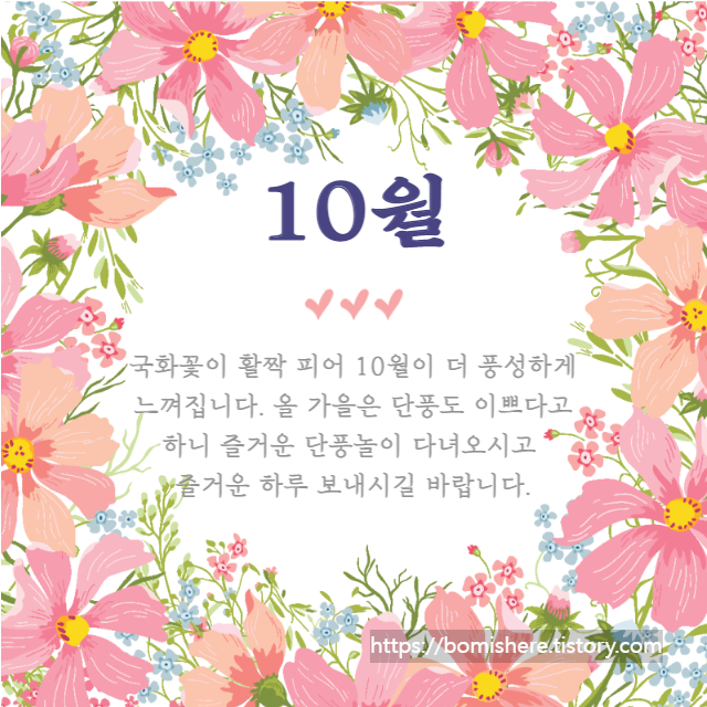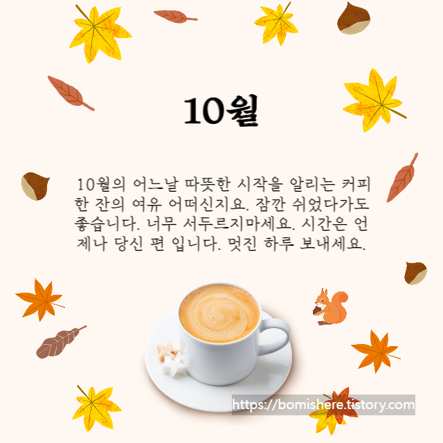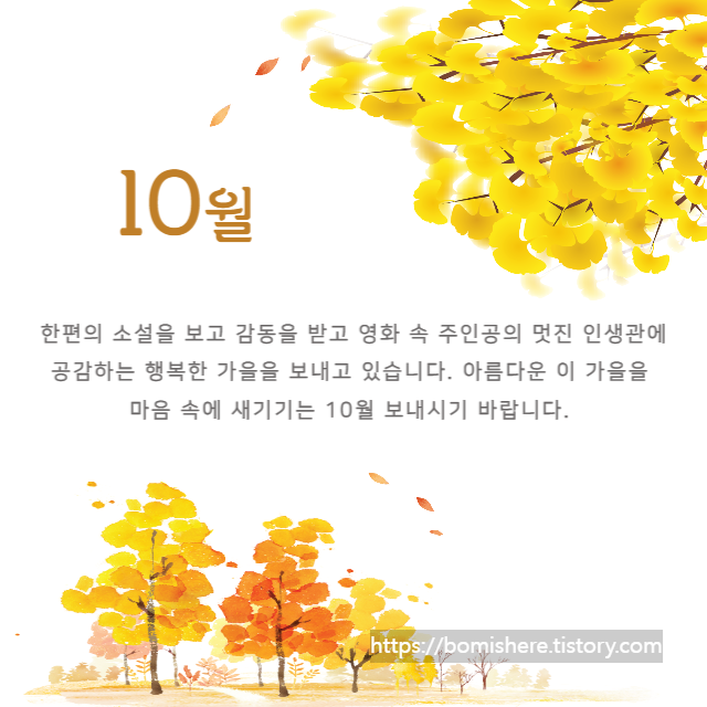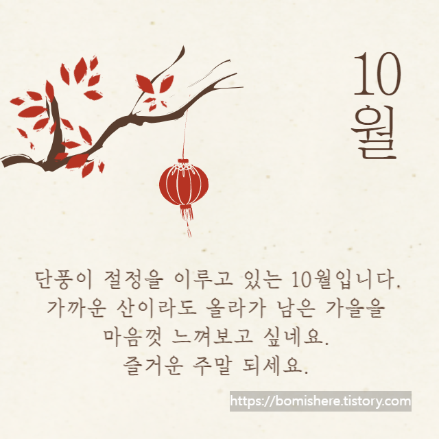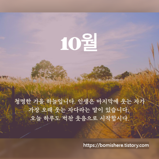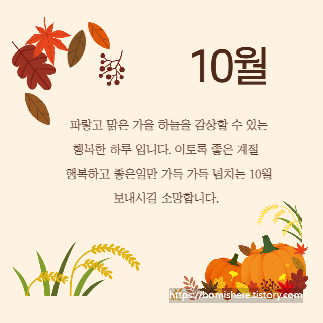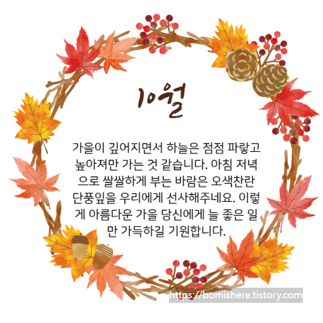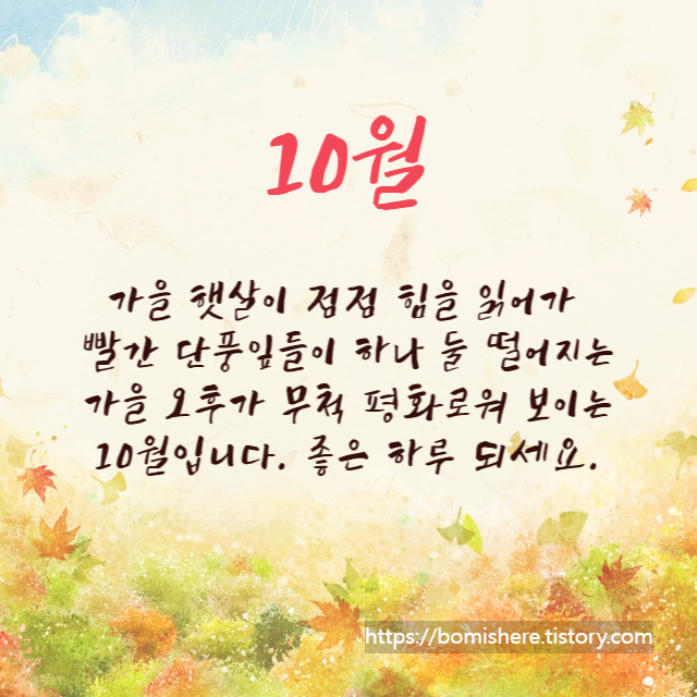 ※ 10월 인사말 이미지는 무료 이미지를 활용하여 직접 제작한 것들이니 개인적인 용도로는 사용하셔도 되지만 개인 블로그나 카페로 퍼가실 경우 엄중히 조치하도록 하겠습니다.