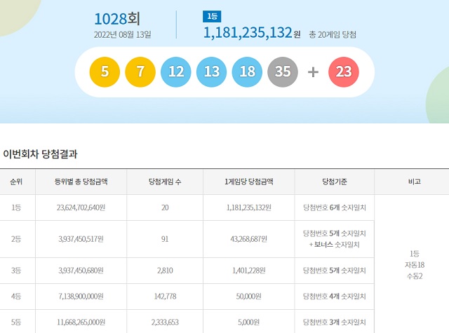 지금까지 제1028회 로또 당첨 번호 소식을 전해드렸습니다. 결론적으로 정리하면 20명이 1등에 당첨됐고 1등 당첨금은 각 11억 원씩입니다. 또한 로또 1등 20명 중 18명이 자동으로 구매, 나머지 2명은 수동으로 1028회 로또 당첨 번호 6개를 다 맞혔습니다.