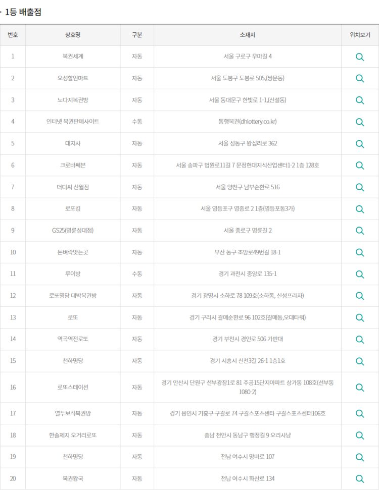 참고로 로또 당첨 번호 자동으로 1등이 배출된 판매점은 총 18곳입니다. 또한 수동 선택으로 로또 1등이 된 당첨자는 2명으로 집계됐는데 동행복권과 과천에서 나왔다고 합니다.