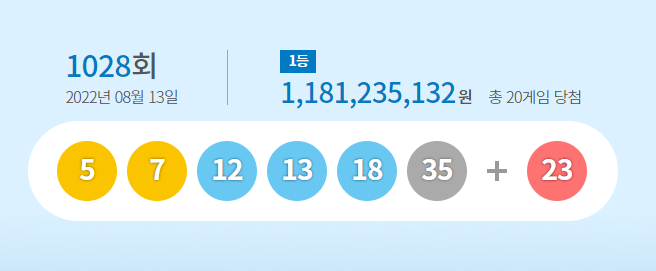 지난 13일 추첨한 제1028회 동행복권 로또 당첨 번호는 '5, 7, 12, 13, 18, 35'이며 2등 보너스 번호는 '23'입니다.