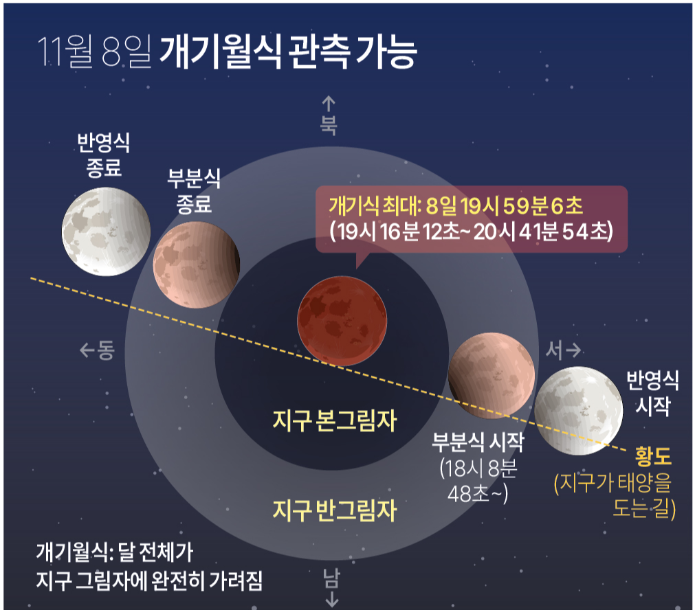 월식의 가시 경로는 총 3시간 40분 동안 지속될 예정인데요, 이 중 개기월식은 서울 기준으로 11월 8일 오후 7시 16분부터 오후 8시 41분까지 총 1시간 25분 동안 지속되는 것입니다.