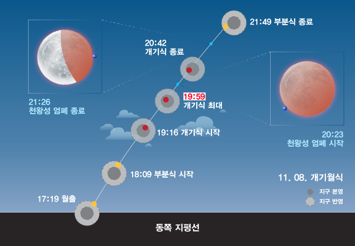 이번 11월 8일 개기월식과 천왕성 엄폐 동시 발생은 저녁 시간에 우리나라 전역에서 관측할 수 있다고 합니다.
