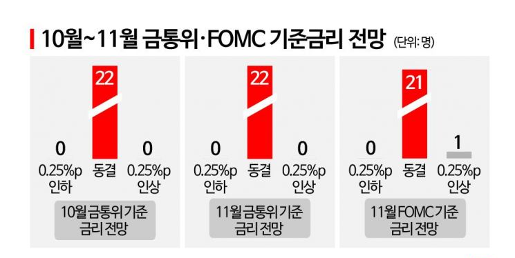 파월 의장은 또한 지난 19일 뉴욕에서 열린 뉴욕경제클럽 연설에서도 인플레이션이 여전히 너무 높다며 경기 과열이 계속되면 추가 금리 인상에 나설 수밖에 없음을 시사하기도 했는데요, 무엇보다 미국 3분기(7~9월) 경제가 전망을 뛰어넘는 호조를 보였기 때문에 현재로서는 오는 11월 FOMC 일정에서 금리 인상 가능성이 없을 것이라는 전망이 우세한 것입니다.