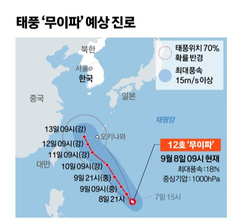 먼저 기상청에 따르면 12호 태풍 무이파가 발생한 것은 지난 8일 오전 9시, 일본 오키나와 남동쪽 1,200㎞ 해상에서였습니다. 이날 기준 무이파의 중심기압은 1,000hPa로 강도는 중급입니다.