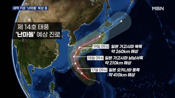난마돌이 우리나라에 가장 근접하는 때는 19일 0시와 오전 사이가 될 것 같습니다. 영남 해안 지역에는 순간 최대 초속 20에서 30m의 강풍과 최대 120mm의 많은 비가 예보되었습니다. 문제는 난마돌의 진로가 좀 더 북쪽으로 올 경우인데, 이렇게 되면 영남 해안에는 훨씬 더 강하고 많은 비가 내릴 수 있습니다.