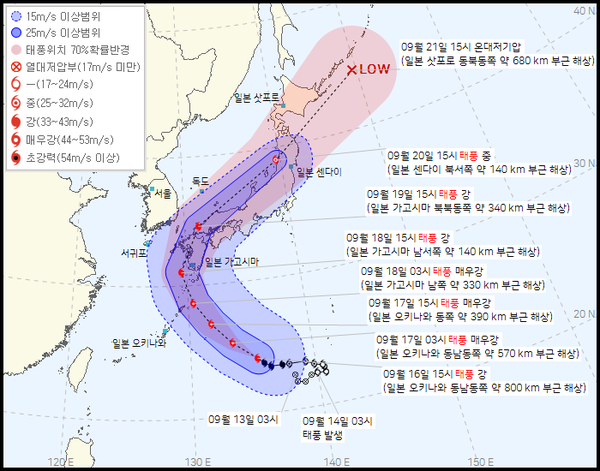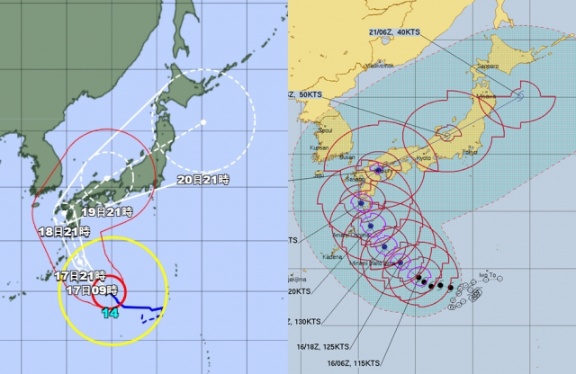 이후 17일 오전 9시 예상 위치는 오키나와 동쪽 470㎞ 해상이며 이에 이를 때에는 강도가 '매우 강'이 될 것으로 예상되고 있습니다.