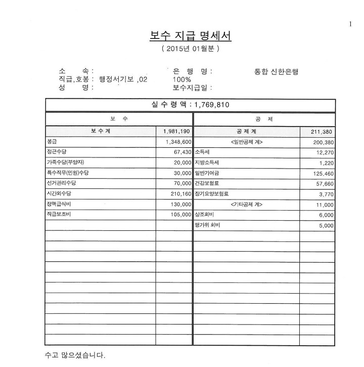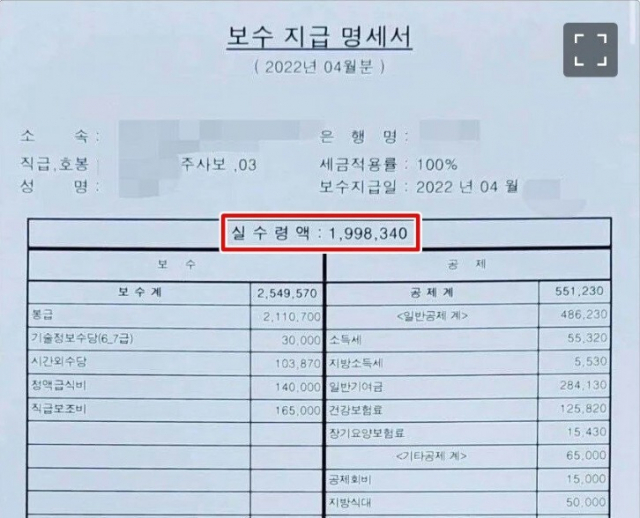 공무원 봉급표 실수령액의 경우 공무원들이 직접 공개하는 급여 명세서를 참고할 수 밖에 없는데요, 얼마 전 서울시공무원노동조합이 공개한 9급 1호봉의 실수령액을 보면 세후 월 168만원 수준이라고 해 논란이 된 적이 있습니다.