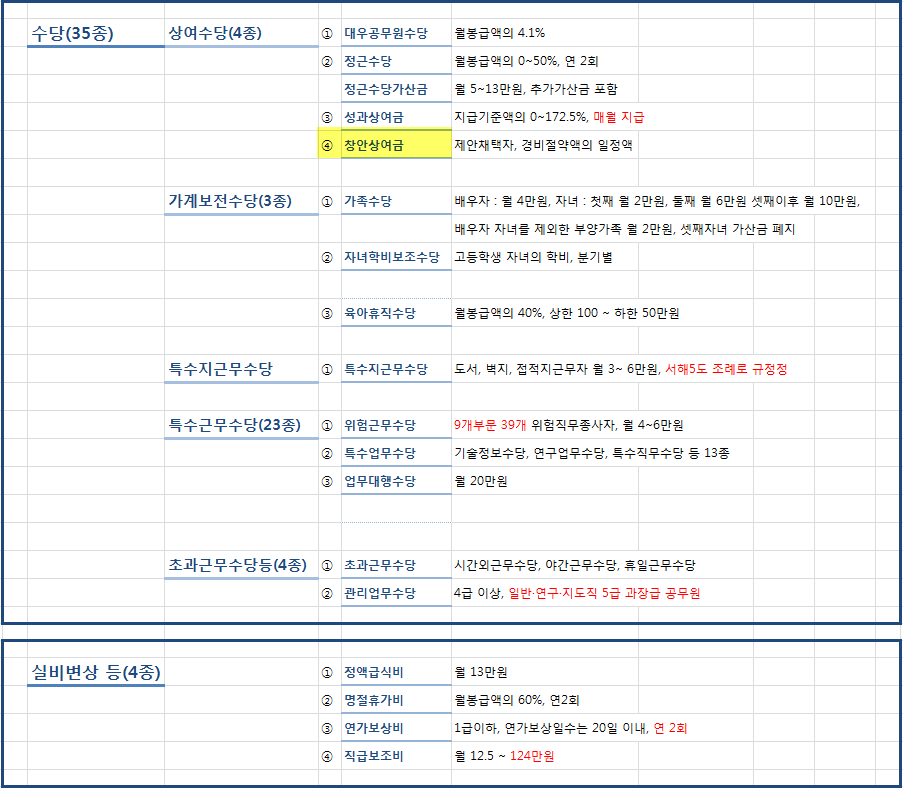 2022년 공무원 봉급표를 통해 기본급을 알아봤습니다. 하지만 아까 말씀드린대로 공무원 봉급은 기본급만 포함되는 것이 아닌 직무여건 및 생활여건 등에 따라 지급되는 부가급여, 즉 수당이 포함되어있습니다. 공무원 수당은 총 18종으로 5개 분야 총 14종의 수당(상여수당, 가계보전수당, 특수지근무수당, 특수근무수당, 초과근무수당) 등이 있습니다.