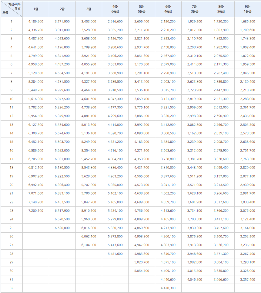 2022년 공무원 봉급표를 보시기 전에 한 가지 알아둘 것이 있는데요, 공무원 월급은 호봉별로 다르다는 것과 가장 낮은 1호봉부터 시작하여 9급 공무원의 경우 31호봉까지 있다는 것입니다.
