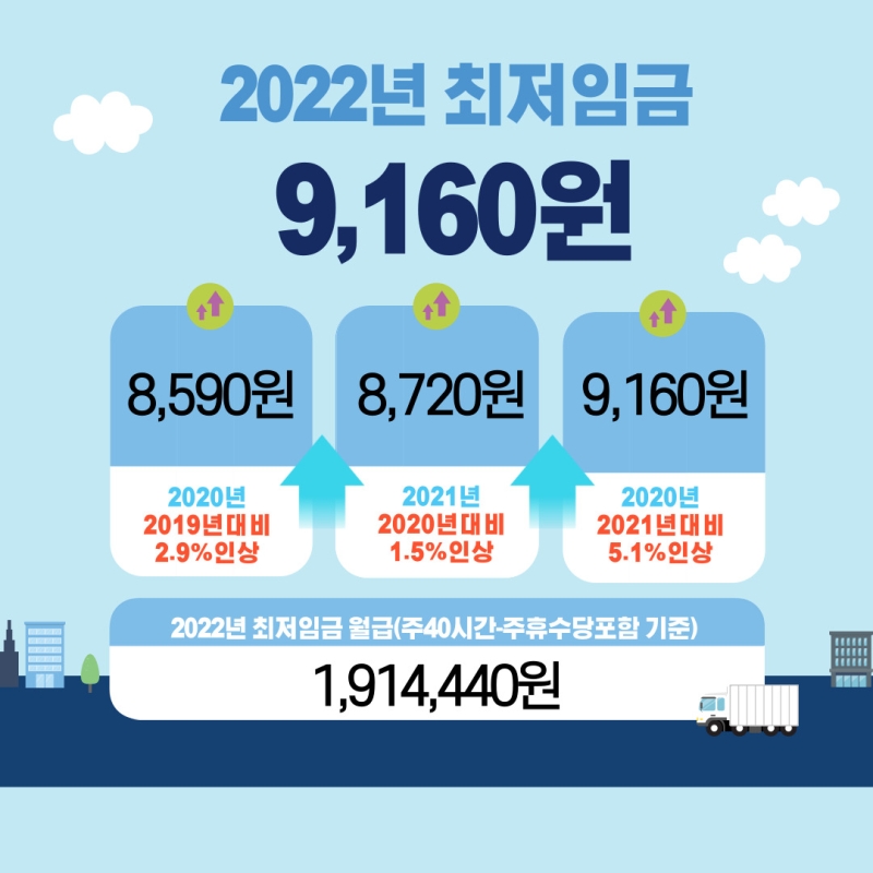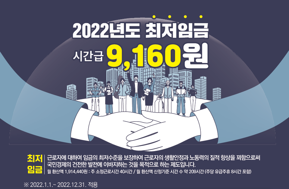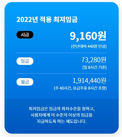 2022년 최저임금은 9,160원으로 확정되었습니다. 최저시급은 말 그대로 생계를 위한 최저 수준으로 정한 임금 기준으로 저임금 근로자들에게는 중요하게 챙겨볼 수밖에 없는 부분인데요, 최저 시급 9160원, 최저 월급은 191만4440원입니다.