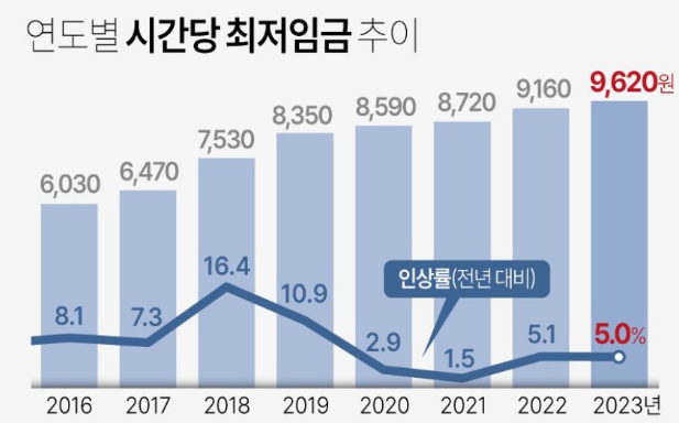 2022년 최저시급 9160원은 2021년 8720원에서 5.04% 오른 것입니다. 주 15시간 이상 일한 경우, 일주일에 하루를 유급으로 쉴 수 있는 주휴수당을 받을 수 있는데 주휴수당을 포함하게되면 최저시급은 1만 992원 수준이 됩니다.