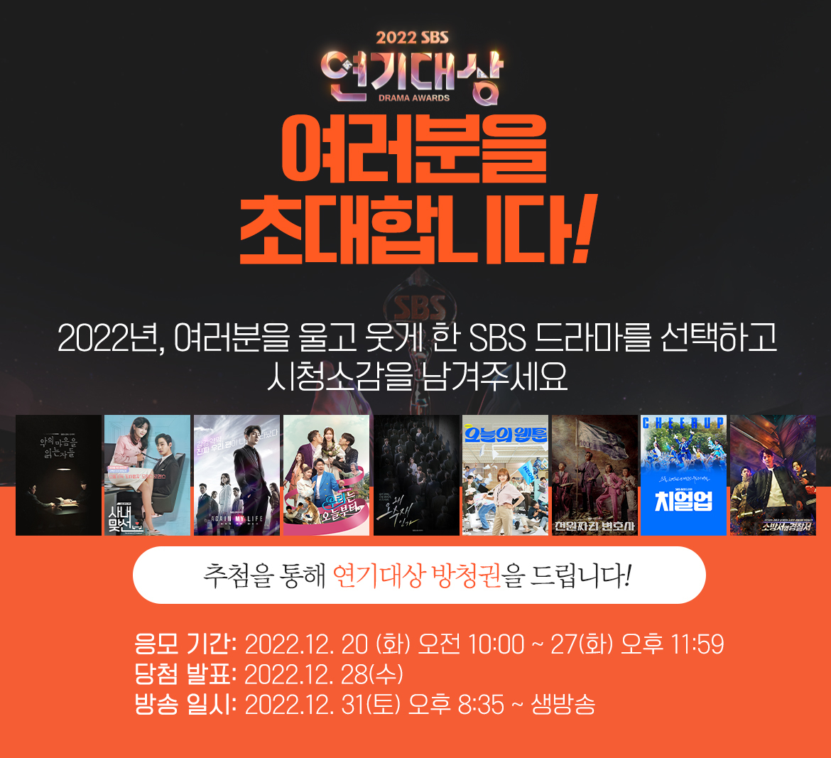 '2022 SBS 연기대상'은 오는 12월 31일 토요일 오후 8시 35분부터 방송됩니다.