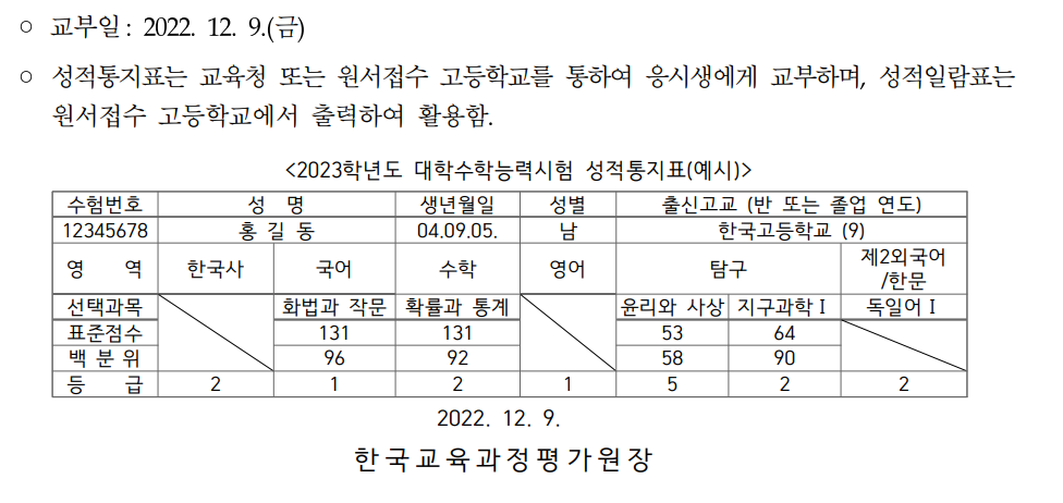 ● 수능 성적 통지일 : 2022년 12월 9일 금요일