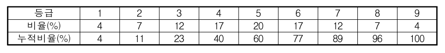 등급은 표준점수를 기준으로 나타내는데요, 수험생의 상위 4%까지를 1등급, 그 다음 7%를 2등급으로 하여 순차적으로 등급을 부여하는 것입니다. 정수화된 표준점수에 근거하여 백분위를 산출하고 소수 첫째자리에서 반올림한 정수로 표기하게 됩니다.