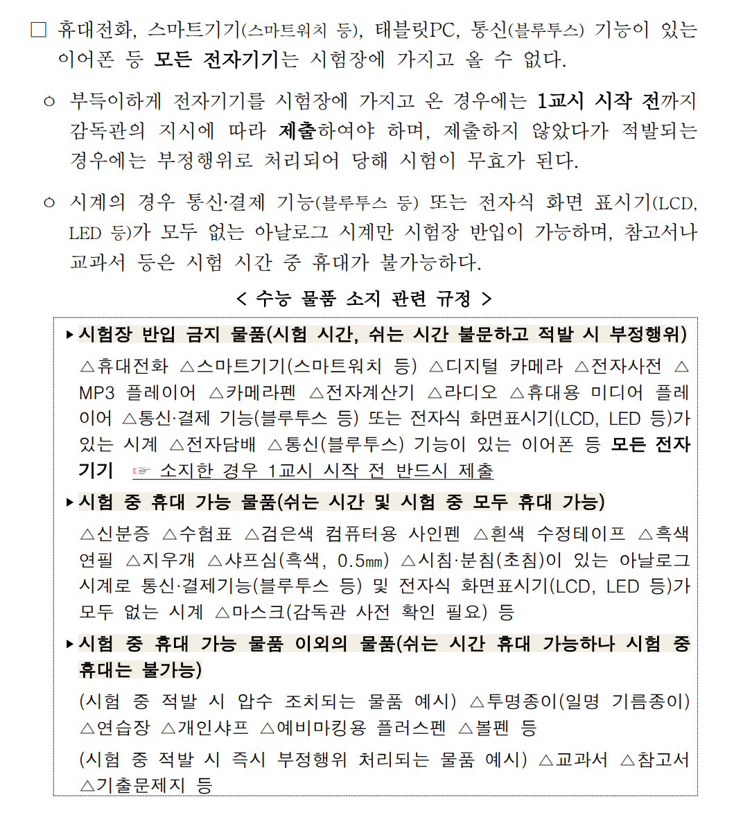 또한 수능 준비물 중 가장 중요한 것이 본인임을 입증할 수 있는 신분증(주민등록증 등 사진이 부착된 신분증)과 수험표인데요, 수험표를 분실했을 경우 시험장 관리 본부에 말씀하셔서 입실 전까지 수험표를 재교부 받아 시험장에 입실하면 됩니다. 마지막으로 시험실에는 시계가 없기 때문에 휴대가능한 아날로그 시계도 준비하는 것이 좋습니다. 그동안 열심히 노력해 온 수험생 여러분 모두에게 좋은 결과가 있기를 바랍니다.
