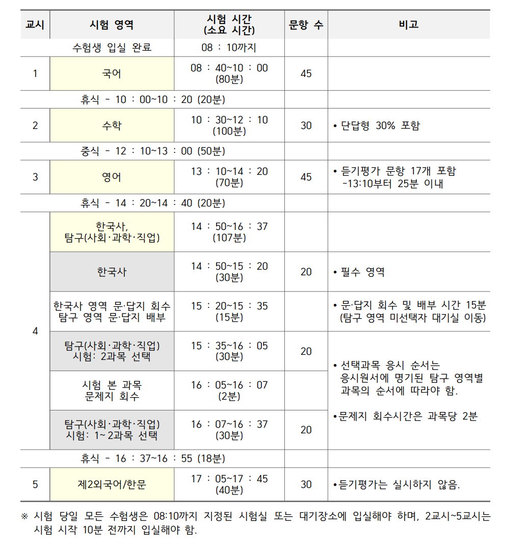 ● 4교시는 한국사 영역 시험이 먼저 진행되고 나서 탐구 영역 시험이 진행됩니다. 한국사 영역 종료 후 15분 동안 문답지 회수 및 탐구 영역 미선택자 대기실 이동 시간이 있습니다.