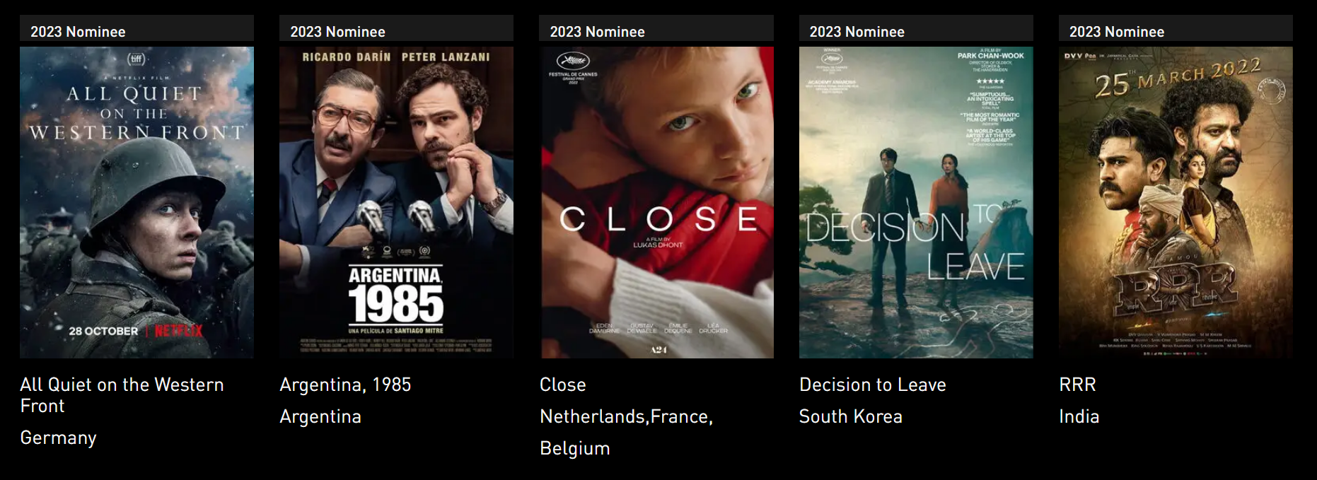 미국 골드 더비가 실시한 '2023 골든글로브 영화 부문' 예측 설문조사에 따르면 비영어권 작품상 분야 1위는 'RRR'(14표), '서부 전선 이상 없다'(2표), '헤어질 결심'(총 17표 중 1표) 순이었다고 합니다. 또 다른 매체인 넥스트베스트픽처(Nextbestpicture) 투표에서는 'RRR'(총 10표 중 7표), '서부 전선 이상 없다'(2표), '헤어질 결심'(1표) 순으로 진행되고 있는 상황입니다.