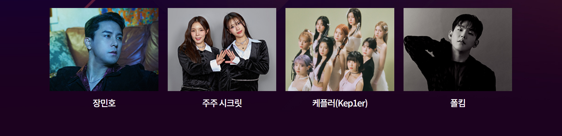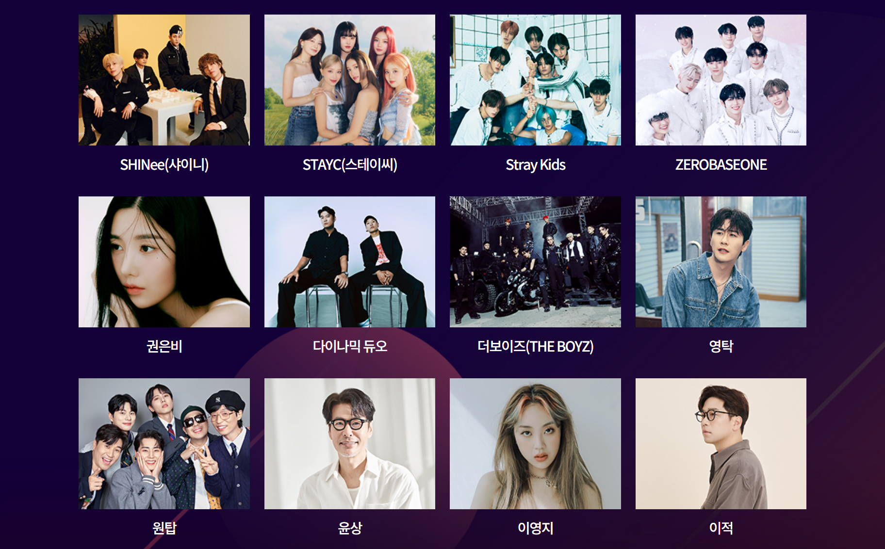 &TEAM, (여자)아이들, 2AM, aespa, ATBO, ATEEZ, 백호, BEBE, BOYNEXTDOOR, CRAVITY, DAY6, ENHYPEN, FANTASY BOYS, 프로미스나인, 효연, ITZY, IVE, LUCY, NCT 127, NCT DREAM, NCT U, NiziU, NMIXX, RIIZE, SHINee, STAYC, Stray Kids, 1MILLION, ZEROBASEONE, 권은비, 다이나믹 듀오, 더보이즈, 영탁, 원탑, 윤상, 이영지, 이적, 장민호, 주주 시크릿, Kep1er, 폴킴 (총 42팀)